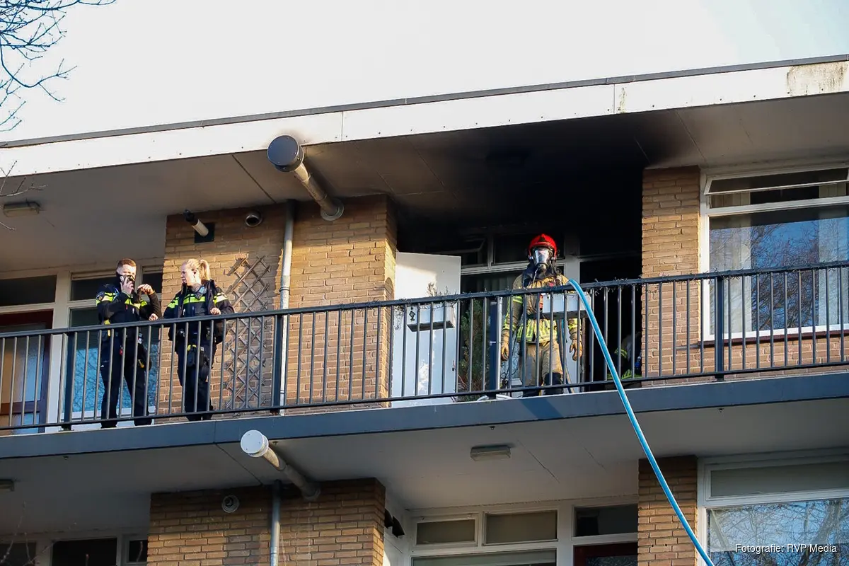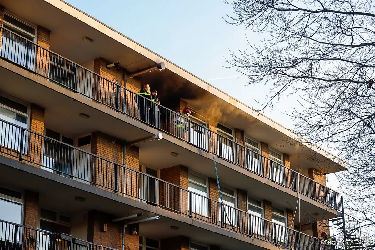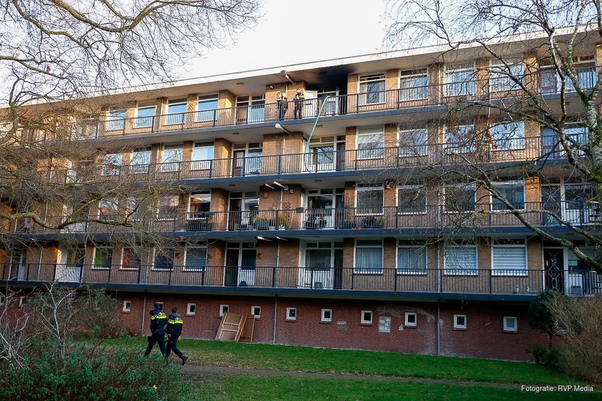 Aan de buitenkant is goed te zien dat het afdakje bij de voordeur helemaal zwart is. Door de brand moest de flat worden ontruimd.