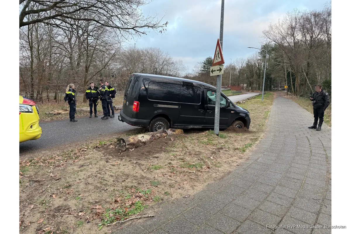 HILVERSUM – Maandagmiddag is op de Amersfoortsestraatweg in Hilversum een busje uit de bocht gevlogen. Het voertuig raakte van de weg en kwam tot stilstand naast de rijbaan, tegen enkele boomstammen.