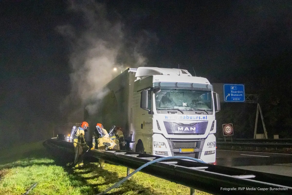 NAARDEN - Woensdagochtend vroeg rond 04:00 uur is een vrachtwagen tijdens het rijden in brand gevlogen op de A1 bij Naarden.