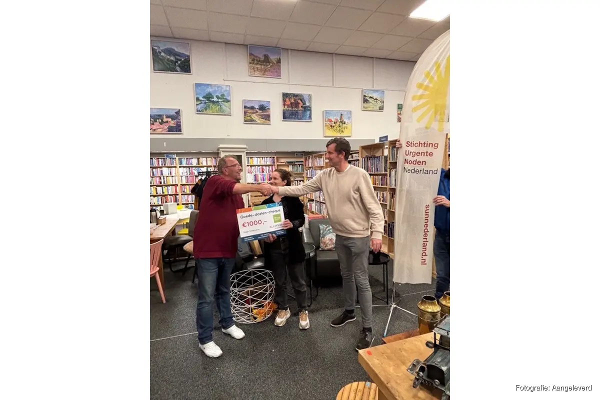 HILVERSUM - Rob Schram, voorzitter van Kringloop Kleurrijk en van Fonds Kleurrijk, de 'Goede-doelen-Pot' van Kleurrijk, overhandigde vrijdag 16 januari jl. in het bijzin van Kleurrijk-klanten een cheque van €1000,- aan Lenka Nieuwenhuis (coördinator) en Harro Wichers (penningmeester) van Stichting Urgente Noden-Hilversum. Het geld wordt toegevoegd aan het SUN-giftenbudget waaruit SUN-Hilversum betalingen doet om mensen te helpen die in een uitzichtloze situatie zijn beland.