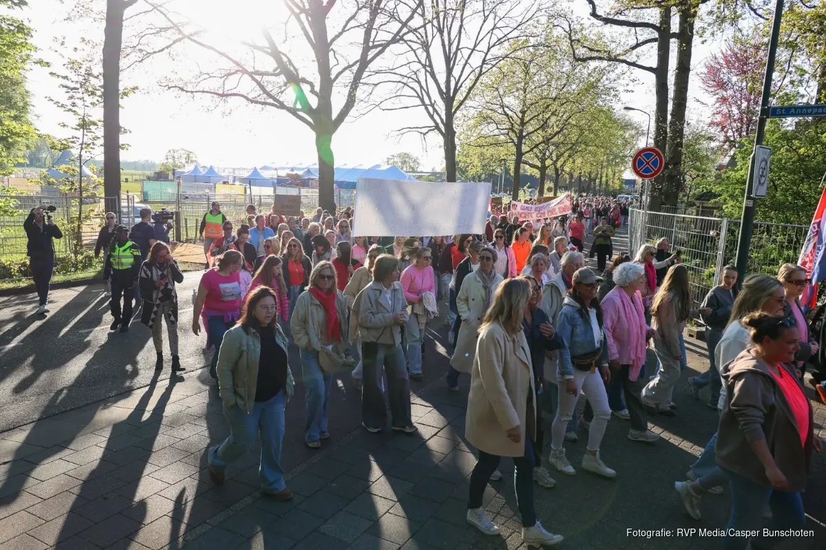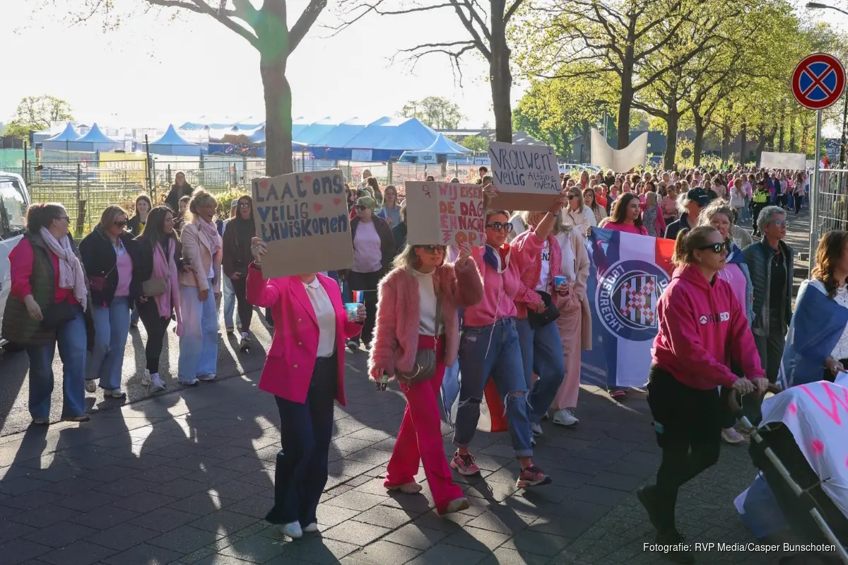 Er lopen ongeveer 300 vooral in roze gekleede vrouwen mee welke spandoeken met zich mee dragen. De politie begeleid de demonstratie.