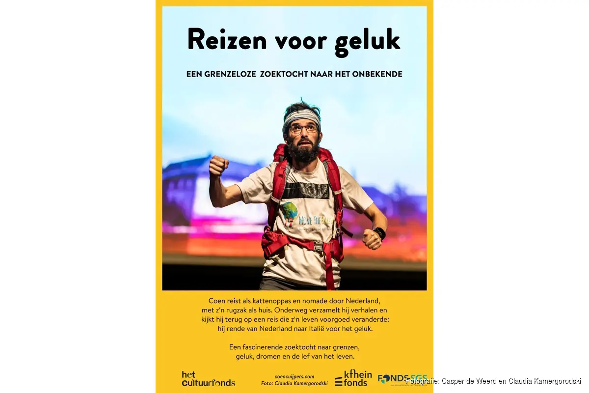 HILVERSUM - Zondagmiddag 3 mei speelt Coen Cuijpers (Boxmeer, 1981) zijn nieuwe theatervoorstelling 'Reizen voor geluk' in Theater Kleintje Kunst te Hilversum. De voorstelling is een samenspel van twee waargebeurde avonturen: een leven als kattenoppas en nomade én een hardlooptocht waarin Coen in 72 marathons en 112 dagen voor het geluk van Gennep naar Palermo rende. De voorstelling is de vijfde stop van zijn theatertour, die tot nu toe negen speelplekken kent. Regie is in handen van Hugo Haenen.